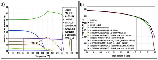 (a) Diagram of the proportion of phases as a function of temperature for sample EN AW 6026-In; (b) Scheil’s diagram for sample EN AW 6026-In.