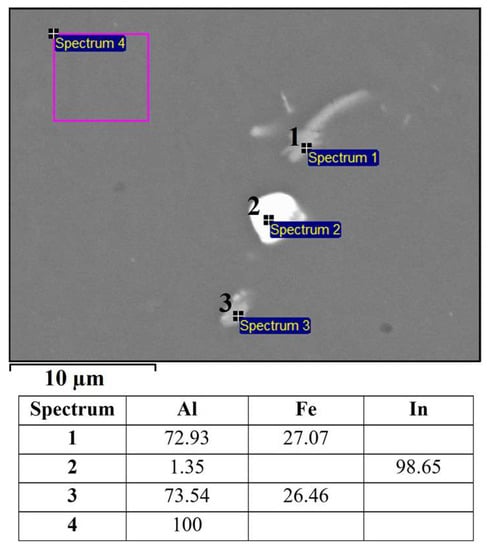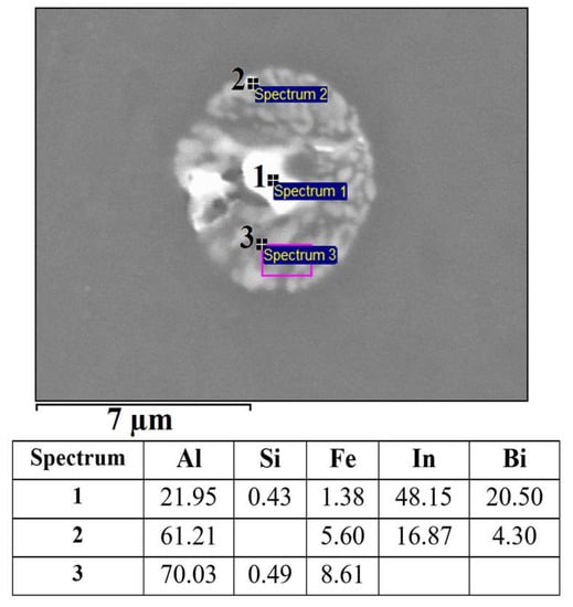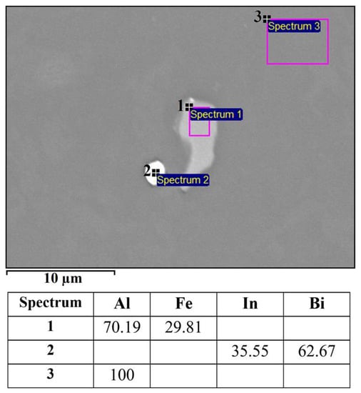 The microstructure of the alloy EN AW 1370-BiIn is shown in Figure 6. Compared to the microstructure of EN AW 1370-In, a higher proportion of spherical eutectics can be observed. From the SEM–EDS analysis, the presence of α-Al, Al13Fe4, and bright BiIn phases in the microstructure is evident (Figure 7).