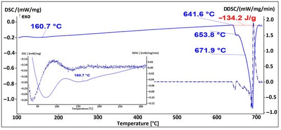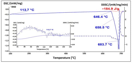 The microstructure of the alloy EN AW 1370-BiIn with marked EDS analysis sites is shown in Figure 7 and Figure 8. The results of the EDS analysis confirm the presence of the Al13Fe4 phase (Figure 7, Spectrum 1) and the BiIn phase (Figure 7, Spectrum 2). The DSC analysis (Figure 9) also detected the endothermic peak at 113.7 °C, which is very close to the BiIn phase melting point (109.7 °C) in the equilibrium Bi–In phase diagram []. Figure 8 shows spherical particle consisting of extremely small, bright particles based on Bi, In and Al, combined with Fe and a small amount of Si. According to thermodynamic calculations, the iron phase with Si could be either one of the metastable or stable phases Al8Fe2Si or Al8Fe2Si2 and the phase based on Bi, Al, and In could be the BCT_A5 phase. The combination of these phases with the α-Al phase could form a ternary eutectic (α-Al + Al8Fe2Si + (Al, In, Bi)). The DSC curve (Figure 9) shows clear endothermic peaks at temperatures of 646.4 °C, 658.5 °C, and 683.7 °C. These peaks correspond to the melting of the eutectics (α-Al + Al8Fe2Si + (Al, In, Bi)), (α-Al + Al13Fe4), and α-Al solid solution.