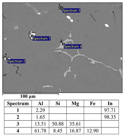 Equilibrium isopleth diagrams and non-equilibrium Scheil–Gulliver solidification models were created using Thermo-Calc software for all synthesised alloys. However, in this article, we present the diagram only for the EN AW 6026-In alloy. These diagrams allow us to identify individual microstructural phases and compare the equilibrium and non-equilibrium states with the actual solidification sequence of the alloy. The Thermo-Calc software calculates these diagrams based on thermodynamic laws, a TCAL-6 database of experimentally determined parameters and the assumption of equilibrium solidification []. Table 5 shows the predicted phases for all four alloys. According to all Thermo-Calc calculations, indium is expected not to react with other elements and to be present in its elemental form in the microstructure. A similar prediction is made for bismuth in the alloy EN AW 6026-BiIn. The Thermo-Calc calculations did not predict the formation of the intermetallic phase Mg3Bi2, which formed experimentally in the alloy EN AW 6026 with bismuth addition and in the alloy EN AW 6060 with tin and bismuth addition [,].