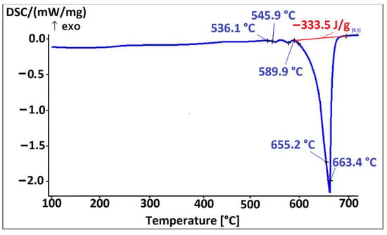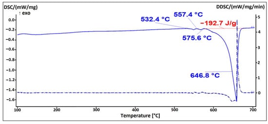 - The microstructure of the alloy EN AW 6026-In exhibited a higher degree of complexity and comprising an α-Al matrix, (α-Al + Al5Cu2Mg8Si6), (α-Al + Mg2Si), and (α-Al + Al15Si2(FeMn)4) binary eutectics as well as particles of elemental indium. Unfortunately, the DSC method could not reliably detect the melting or solidification of indium particles, due to their small number and the low enthalpy of indium. On the DSC heating curve, the initial prominent endothermic peak was seen at 532.4 °C, indicating melting of the (α-Al + Al5Cu2Mg8Si6) eutectic. Other endothermic peaks were observed at temperatures of 557.4 °C and 575.6 °C, indicating the melting of the (α-Al + Mg2Si) and (α-Al + Al15Si2(FeMn)4) eutectics, while the α-Al solid solution exhibited a melting point at 646.8 °C.