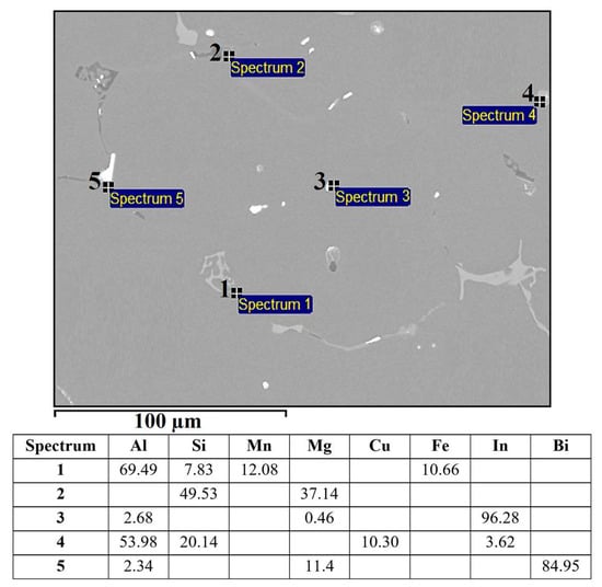 SEM micrograph of EN AW 1370-BiIn with EDS results [wt.%].