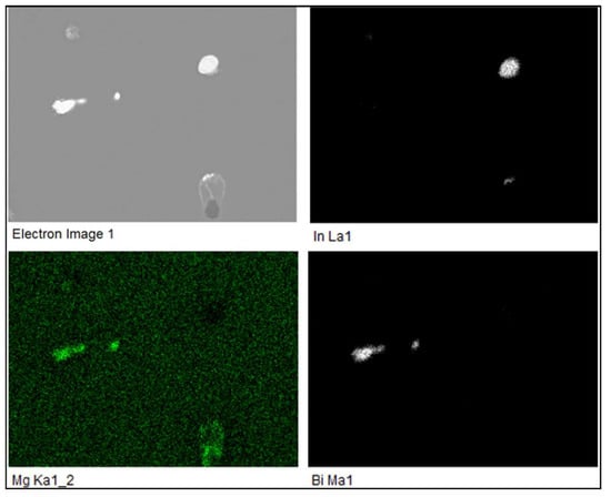 Figure 13 shows the microstructure of the alloy EN AW 6026-BiIn. Based on EDS analysis and a combination of equilibrium and non-equilibrium solidification diagrams, we identified the following microstructural phases: α-Al, Al15Si2(FeMn)4, Mg2Si, Al5Cu2Mg8Si6, Mg3Bi2, and indium particles. Morphologically, the Al5Cu2Mg8Si6 phases exhibited similar characteristics to those of the alloy EN AW 6026-In. EDS mapping was carried out to determine the specific distribution of each alloying element, focusing on Mg3Bi2 and In particles. Indium was found not to react with any of the alloying elements. However, in the case of Mg3Bi2 phase particles, an overlap between Bi and Mg was observed (Figure 14). Due to the formation of the Mg3Bi2 phase, the BiIn phase was not detected in the microstructure, unlike the alloy EN AW 1370-In. The DSC heating curve (Figure 15) did not show any endothermic peaks indicating the presence of the BiIn phase’s presence nor were there any prominent endothermic peaks in the temperature range from 150 °C to 170 °C, indicating the melting of indium. Nevertheless, Spectrum 3 in Figure 13 indicated that the identified proportion of indium was 96.28 wt.%, and the mapping analysis demonstrated that In did not interact with other elements, confirming its presence in its elemental form. The first significant endothermic peak (Figure 15) occurred within the temperature range of 536.1 °C to 545.9 °C, corresponding to the melting of the Al5Cu2Mg8Si6) and (α-Al + Mg2Si) eutectics. The most notable peaks corresponded to the melting of the (α-Al + α-Mg3Bi2) and (α-Al + Al15Si2(FeMn)4) eutectics at temperatures of 589.9 °C and 655.2 °C, and the α-Al solid solution melted at a temperature of 663.4 °C.