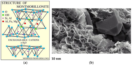 The chemical structure of layered silicate (a) and SEM micrograph of the microstructure of layered silicate (zoom 4000×) (b) [31,32].
