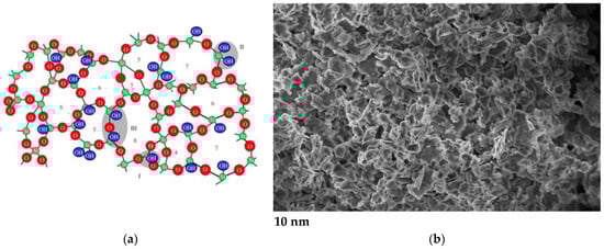 The chemical structure of Aerosil (a) and SEM micrograph of the microstructure of Aerosil (scale bar 4000×) (b) [43,44]. The numbers 3–8 are the number of groups of (Si–O–) and I–III are the numbers of Si–OH groups.