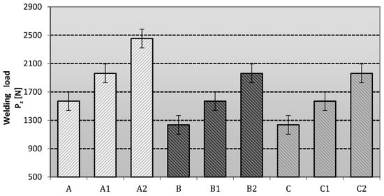 Welding load of friction node with lubricants with different vegetable dispersion phases and modified by silicon nanoadditives. A–C: designation of the tested grease.