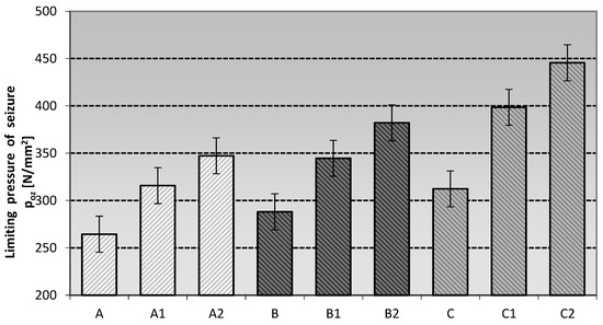The limiting pressure of seizure of friction nodes with lubricants with different vegetable dispersion phase and modified by silicon nanoadditives. A–C: designation of the tested grease.