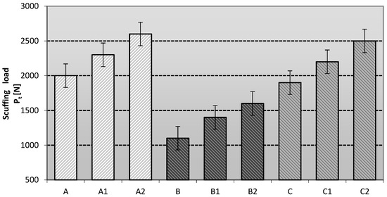 The antiscuffing characteristics with gradually increasing loads on the friction node for the tested lubricants depend on the type of base oil and the type of modifying additive used, which significantly affects the lubricating properties of the prepared grease compositions and the stability of the tribological film (Figure 3). The most favorable anti-scuffing protection is characteristic of greases based on rapeseed oil (A2) modified with one of the layered silicates, i.e., montmorillonite. The lubricating compositions based on linseed and soybean oil and modified with the above-mentioned nanoadditive (B2 and C2) did not show such favourable changes in the anti-scuffing properties as the A2 compositions, although an improvement in the properties is noticeable in relation to the base composition without the modifying additive.