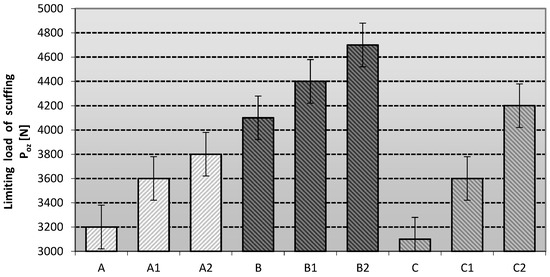 The scuffing limit load of the friction point was also determined using the lubricant blends. The data are shown in Figure 6.