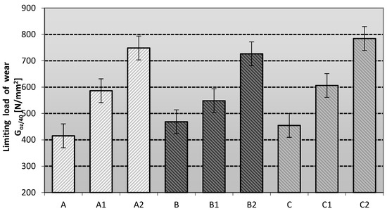 The limiting wear load makes it possible to determine the level of anti-wear properties of the lubricants under testing. The level of stabilization of the film is defined by the index of the limiting load of wear Goz/40. The higher the value, the better the stability of the lubricant and its anti-wear properties. The highest value of this parameter was observed for the linseed-based lubricant (B), slightly lower for the soy-based lubricant (C), and the lowest value of this parameter represents the rapeseed-based lubricant (A). Soy-based lubricants modified with one of the phyllosilicates, montmorillonite (C2), had the best anti-wear properties. The rapeseed-based lubricants modified with montmorillonite (A2) were characterized by slightly weaker properties, and the weakest effect of the layered silicate was observed for the composition prepared in linseed oil (B2). An improvement of the tribological properties was noticeable with respect to the basic compositions without the modifying additive, but a faster increase was observed for the compositions prepared in soybean and rapeseed oil. The lubricating compositions modified with amorphous silica (Aerosil) showed weaker antiwear properties than the tested lubricants modified with layered silicates, regardless of the base oil used. The most favourable effect of amorphous silica in improving the antiwear properties in comparison with the base compositions was observed for the lubricants based on soybean oil (C1), slightly worse in the case of using rapeseed oil (A1), and the weakest effect of this modifier was obtained for lubricants based on the linseed dispersion phase (B1). The comparison with the lubricants based on the vegetable dispersion phase modified with nanoadditives showed an improvement in the general antiwear properties, which was not as clear for the lubricants based on synthetic or mineral dispersion phase [29].
