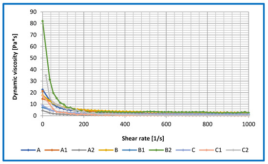 The tests were carried out to determine the appropriate shear rate for the lubricant compositions tested. As a result of the research conducted, it was observed that the shear rate in the range of 0–1000 [1/s] best illustrates the differences between the individual lubricant compositions. For the compositions based on vegetable oils, a positive effect of the applied nanoadditive in the form of amorphous silica and montmorillonite on changes in the dynamic viscosity at high shear rates was observed; the viscosity value decreased in comparison to the base composition without additives. The introduction of layered silicate in the form of montmorillonite into the structure of grease based on vegetable oils showed a negative effect of the used additive on viscosity changes at a low shear rate, which was caused by insufficient distribution of the used additive in the structure of the tested lubricant. Too short of a homogenization time could cause significant changes in the dynamic viscosity at low shear rates for the tested greases.
