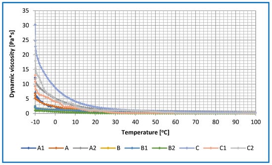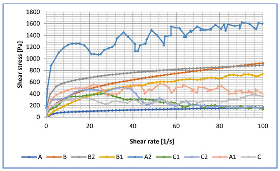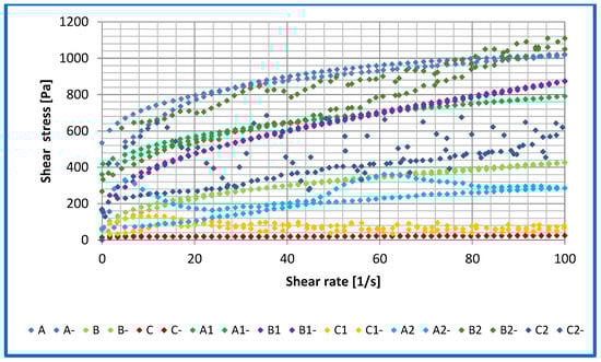 The tests were performed at a temperature of 20 °C. The shear rate range over which the tests were carried out (0–100 s−1) and the measuring intervals at which the data were collected (number of measuring points, total measuring time and frequency of data collection) were then determined. For the viscosity curves, the temperature range was −10–100 °C and the shear rate was 1000 s−1 [11,12,14]. For the flow curves, a logarithmic curve was used in order to collect more points at the beginning of the range, which is crucial for determining the minimum flow limit.
