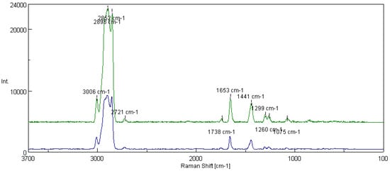 Raman spectroscopy provides information on the chemical structure of materials subjected to temperature and mechanical stress during processing and allows structural changes to be monitored over time. Observation of changes in the chemical structure of materials allows a comprehensive assessment of the influence of process conditions on the state of their structure and provides a comprehensive characterization of the integrity of the systems under investigation at the microscale [97,98,99,100,101]. A Raman spectrometer NRS 5100 (Jasco Corporation, Tokyo, Japan) with a scanning laser at a 532.12 nm wavelength and a CCD detector was used to investigate the structural changes in the chemical composition of the lubricants after the tribological studies. The specifications of the instrument were as follows: grating 2400 lines/mm, laser power 3.6 mW, digital resolution 3000 μm, spectrum 3700 ÷ 200 cm−1, resolution 2.1 cm−1, zoom lens 20× and exposure time 40 s. The samples were made of steel after the tribological tests [102,103,104,105].