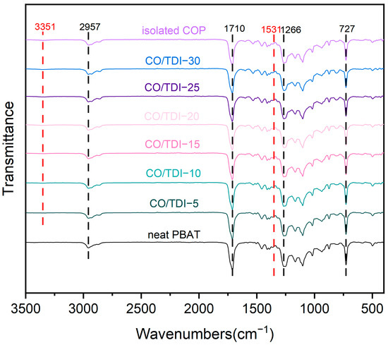 The characteristic absorption peaks of the infrared spectrum of the gel part at 3351 cm−1 and 1531 cm−1 are amide bonds and N-H bonds. These two characteristic absorption peaks can also be found in all composite samples but not in pure PBAT, indicating that COP was successfully formed in the PBAT matrix during the melt-blending process. No characteristic absorption peak of the isocyanate group at 2200 cm−1 was found in all composite samples and gel samples, indicating that TDI can be completely reacted during the melt-blending process, during the melt blending process castor oil reacts in situ with TDI to form a cross-linked COP as shown in Figure 3, and the ester carbonyl in PBAT and the benzene ring coexist in a Yoke effect, so a certain degree of red shift occurs.