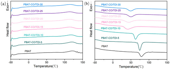 Cooling curves (a) and quadratic heating curves (b) of PBAT and PBAT-CO/TDI composites.