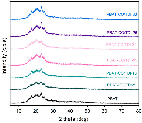 The properties of polymer materials are often closely related to their crystal structures. Therefore, X-ray diffraction analysis can provide an in-depth understanding of the structural properties of polymer materials and provide a basis for further optimizing the properties of polymer materials. As shown in Figure 5, the five characteristic diffraction peaks of PBAT are at 2θ of 16.27°, 17.33°, 20.15°, 23.06° and 24.83°. The figure shows that the XRD diffraction curves of pure PBAT and composite materials are closely similar, and there is no significant difference. The addition of CO/TDI filler does not make the material show new diffraction peaks or the disappearance of diffraction peaks; however, the intensity of the diffraction peaks change a little bit, which indicates that the addition of fillers has no effect on the crystal morphology and crystal phase but that the appropriate amount of fillers promotes the growth of PBAT crystals.