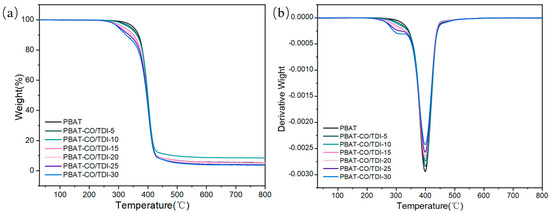 Figure 6 presents the TG and DTG diagrams of PBAT and the complex PBAT-CO/TDI. As shown in the figure, the COP produced by CO and TDI in the PBAT matrix has good fluidity, which can promote the decomposition of PBAT when it is thermally decomposed, so that the carbon in the decomposition products of PBAT can be taken away more easily. The two phases of the polyurethane cross-linked network and PBAT have good compatibility, and the two can form interpenetrating phases to promote the thermal decomposition of PBAT. Therefore, the addition of COP can reduce the carbon residue rate during the thermal decomposition of PBAT and improve the degradability and environmental performance of PBAT-based composites.