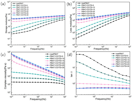 PBAT and PBAT-CO/TDI composites: (a) storage modulus, (b) loss modulus, (c) complex viscosity, (d) loss angle tangent.