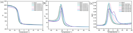 PBAT and PBAT-CO/TDI composites: (a) storage modulus, (b) loss modulus, (c) loss factor.