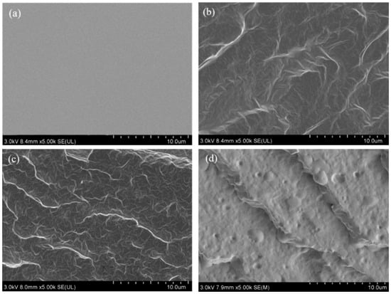 Fracture surface morphologies of (a) PBAT, (b) PBAT-CO/TDI-5, (c) PBAT-CO/TDI-15, (d) PBAT-CO/TDI-30.