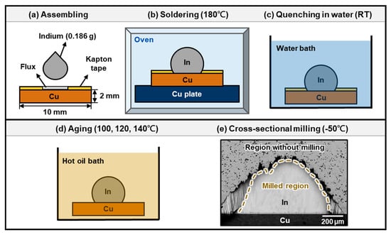 The sample preparation and experimental procedures are illustrated in Figure 2. The copper substrates used in this study were prepared by mechanically grinding and polishing 99.99% oxygen-free Cu plates (Goodfellow, Huntingdon, UK), which measured 10 mm × 10 mm × 2 mm. The last step of the polishing was made with a 1 μm Al2O3 suspension to achieve a mirror-like copper surface. These Cu substrates were etched with 5% H2SO4 solution for 1 min and then cleaned with deionized water for 3 min to remove the copper oxide. Kapton tape with an opening diameter of 4 mm in the middle was then applied to each of the Cu substrates as a solder mask, and a halogen-free no-rinse solder flux was pasted over the holes in the Kapton tape on the Cu substrates, as shown in Figure 2a. After this, an indium shot of 99.9995% purity (Indium Corporation, Clinton, NY, USA) with a weight of 0.186 g was placed on each Cu substrate as the solder. The assembled samples were placed in a convection oven at 180 ± 1 °C for 30 s for soldering, as illustrated in Figure 2b. The process of soldering was carried out to ensure reliable contact of In with Cu. The samples were then retrieved from the oven and quenched in water, as illustrated in Figure 2c. Subsequently, the water-quenched samples were aged in hot oil baths at 100, 120, and 140 °C with a temperature stability of ±1 °C for periods up to 5000 h, as shown in Figure 2d. To elucidate the effect of water quenching and room temperature storage on the formation of CuIn2, some of the samples were directly aged in oil baths without a water-quenching process or additionally stored at room temperature for a long period after aging in the oil bath.