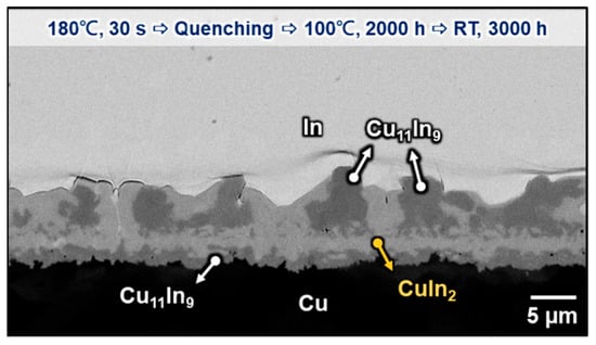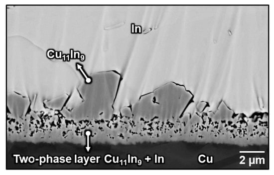 Over recent years, pure indium has been successfully employed as a low-temperature soldering material by Panchenko et al., and fine-pitch Cu–In bonding based on the SLID process was carried out at a peak temperature of 170 °C for 2 min [5,6,7,8]. In their research, the Cu/In joints revealed remarkable shear strengths, ranging from 45 to 120 MPa [7], which were comparable with the strengths of Cu/Sn interconnects [9]. Accordingly, In was a potential material candidate for low-temperature SLID bonding and thermal interface materials [10,11,12,13,14]. Fundamental information on the interfacial reactions between In and Cu is crucial for evaluating the feasibility of In solder. Our recent study revealed the interfacial reactions between liquid In and solid Cu at 180 °C [15]. A two-phase layer consisting of Cu11In9 and In and faceted Cu11In9 particles over the two-phase layer formed at the Cu/In interface [15].