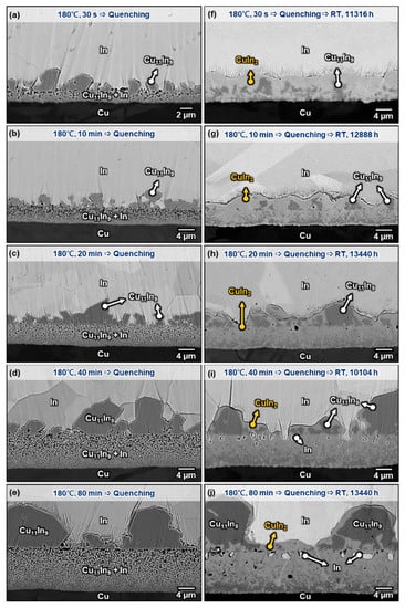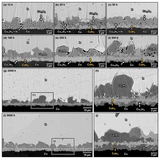 Micrographs showing the Cu/In interfaces after soldering at 180 °C for (a) 30 s, (b) 10 min, (c) 20 min, (d) 40 min, and (e) 80 min, and (f–j) successively stored at room temperature for more than 10,000 h. (Source (a–e) are adopted from our previous study [10]).