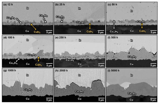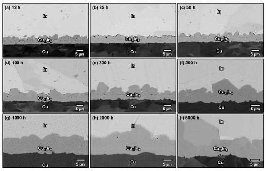 Micrographs showing the Cu/In interfaces after soldering at 180 °C for 30 s, followed by aging at 120 °C for (a) 12 h, (b) 25 h, (c) 50 h, (d) 100 h, (e) 250 h, (f) 500 h, (g) 1000 h, (h) 2000 h, and (i) 5000 h.