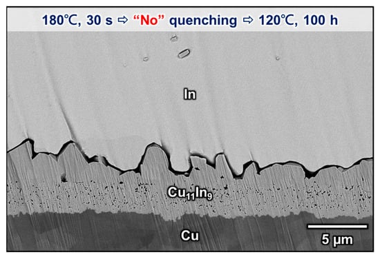 Figure 5a–i shows the microstructures of the Cu/In interfaces after solid-state aging at 120 °C for 12–5000 h. When the aging time was less than 100 h, the CuIn2 phase was observed in the two-phase layer. However, after 250 h of aging, CuIn2 decomposed into Cu11In9 and In, and the microstructure became a continuous layer of Cu11In9 with embedded discontinuous In islands, indicating that CuIn2 is not an equilibrium phase at 120 °C. When the aging time was prolonged to more than 500 h, all the residual In in the continuous Cu11In9 layer had completely disappeared, and the interfacial structure had transformed into a layer-type morphology. The phenomenon of CuIn2 appearing and then disappearing at the interface when aging at 120 °C was probably caused by the water-quenching process between soldering and aging, because the long-term aging results revealed that CuIn2 is not a stable phase at 120 °C. To test this conjecture, the other sample was directly dipped in a hot oil bath at 120 °C for 100 h after soldering at 180 °C for 30 s without a water-quenching process. As shown in Figure 6, Cu11In9 was the only compound formed at the Cu/In interface during aging at 120 °C. Thus, the formation of CuIn2 observed in Figure 5a–d was likely because these specimens were quenched in water and stayed at room temperature for several minutes and because CuIn2 took more than 100 h to decompose at 120 °C.
