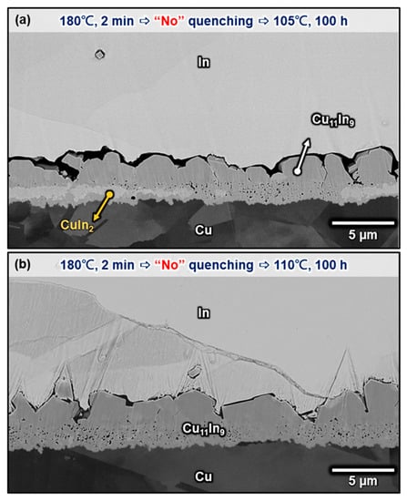 Micrographs showing the Cu/In interfaces after soldering at 180 °C for 2 min and direct aging at (a) 105 °C and (b) 110 °C for 100 h.