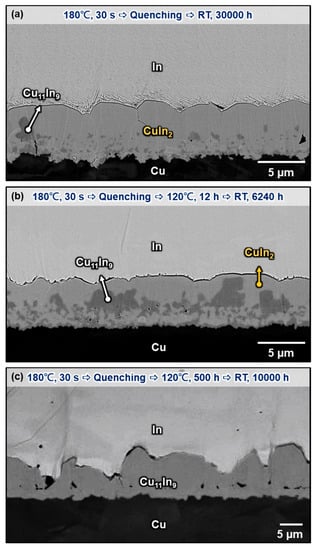 Micrograph showing the Cu/In interfaces after (a) storing at room temperature for 30,000 h, (b) aging at 120 °C for 12 h and storing at room temperature for 6240 h, and (c) aging at 120 °C for 500 h and storing at room temperature for 10,000 h.