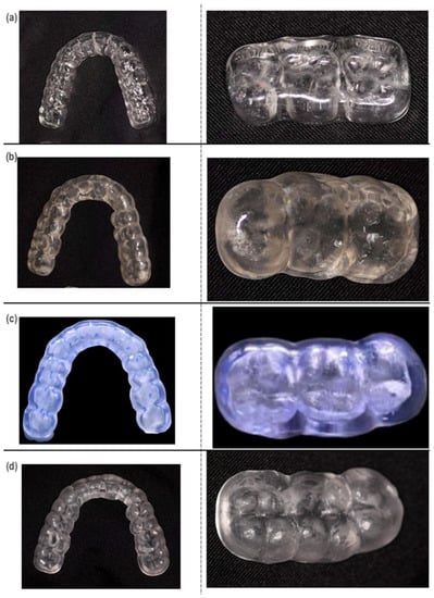 (a) Acrylic splint sample. (b) 3Dprinted splint sample (resin splint). (c) 3D-printed splint sample (resin flex). (d) Milled splint sample.