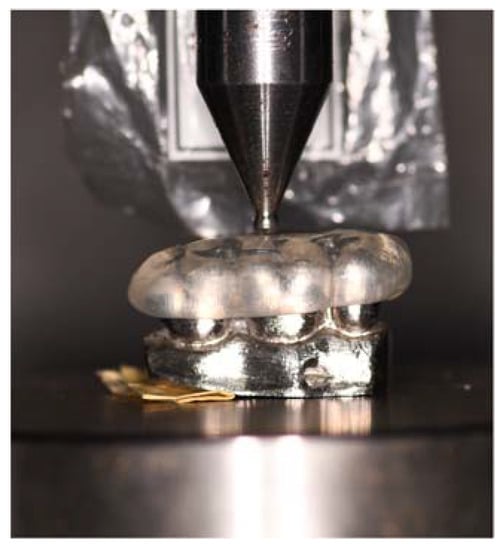 A compression load was applied by a semi-hemispherical indenter (D = 3 mm) with a speed of 0.5 mm/min on the occlusal surface until fracture occurred (Figure 3 and Figure 4). Failure was defined as the moment when the load fell 5% below its maximum value. A preload of 10 N was applied. Fracture surface analysis was performed with the aid of a high-resolution stereo microscope (Nikon C-LEDS, Melville, NY, USA) to identify the fracture mode (Figure 5).