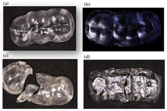 - Lutz, A.-M.; Hampe, R.; Roos, M.; Lümkemann, N.; Eichberger, M.; Stawarczyk, B. Fracture resistance and 2-body wear of 3-dimensional–printed occlusal devices. J. Prosthet. Dent. 2019, 121, 166–172. [Google Scholar] [CrossRef] [PubMed]