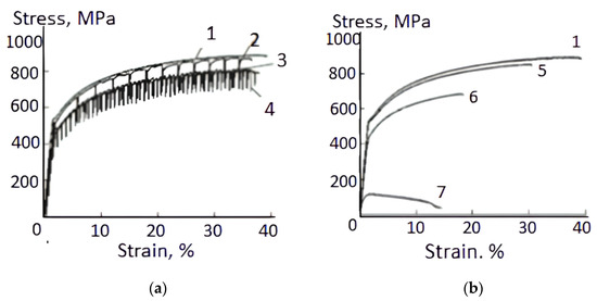 - Korolkov, O.E.; Pakhomov, M.A.; Stolyarov, V.V. Electroplastic effect in titanium alloys during tension. Fact. Laboratory. Diagn. Mater. 2022, 88, 73–82. (In Russian) [Google Scholar] [CrossRef]