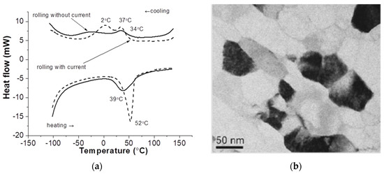 - Potapova, A.A.; Stolyarov, V.V. Relaxation effect of pulse current on Ti50.0Ni50.0 structure during rolling. Mater. Sci. Technol. 2015, 31, 1541–1544. [Google Scholar] [CrossRef]