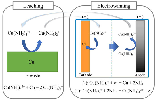 Schematic illustration of the coupled leaching-EW circuit in the Cu(II)-NH3-SO4 system. Adapted from references [7,16].