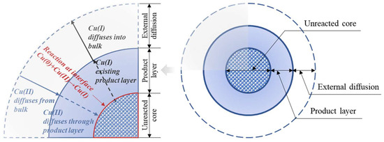 This model is of particular interest because of its approximation of the changing concentration of the reactant that diffuses towards the unreacted core [38]. Because of the high initial input and the continuous change in Cu concentration in the leaching system, the varying Cu concentration was believed to have the most significant effect on the leaching rate.