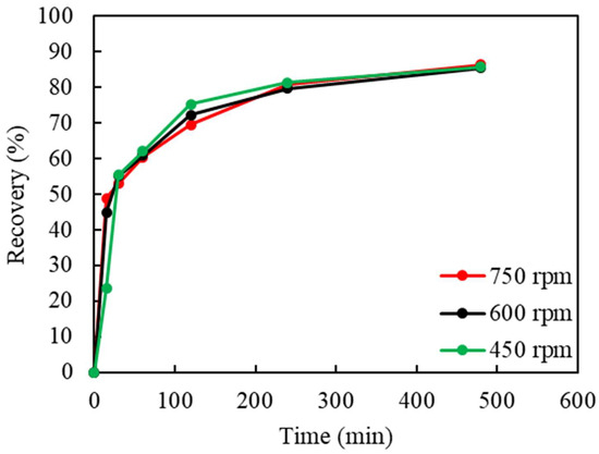 Leaching experiments using shredded RAM chips were carried out to investigate the parameters of significance. A fixed amount of 25 g feed RAM chips, 500 mL lixiviant composed of 1 M (NH3)2SO4 and 4 M NH4OH, and consistent argon cover gas at 0.1 L/min were adopted in all the leaching tests. The effect of the stirring rate, at 450, 600, and 750 rpm, on the Cu recovery is shown in Figure 3. As these three curves from the variation in the stirring rate appear nearly identical, it seems that this variable, in these ranges, has little to no noticeable effect on Cu leaching. The average Cu recovery was 86% at these stirring speeds.