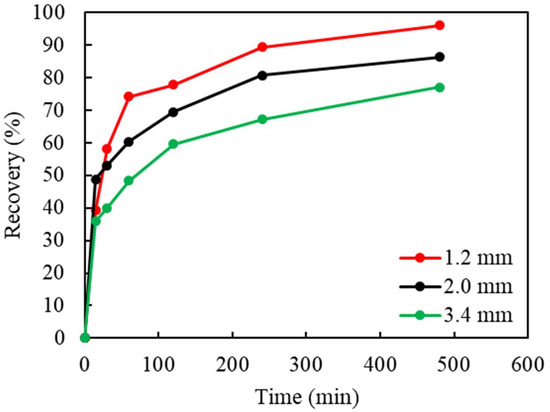 To study the effect of liberation and the impact on the leaching efficiency, waste chips were shredded to a maximum size of 3.4, 2.0, and 1.2 mm, respectively. The effect of the particle size is shown in Figure 4. As indicated, Cu recovery increased from 77% to 86%, and 93%, as the particle size decreased from 3.4 to 2.0, and 1.2 mm, respectively. As the particle size decreased, the surface area of the chips exposed to the lixiviant increased, causing a faster dissolution of Cu(0) into the solution. Although the highest Cu recovery was achieved with the 1.2 mm particle size, this was not selected for additional testing in the experimental series due to the high energy consumption related to mechanical shredding and the high surface tension (increased hydrophobicity), which caused difficulty in wetting the particles in leaching.