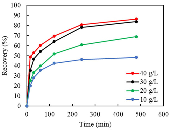 In an anerobic environment, the initial input of oxidizer (Cu(II)) was believed to have the most significant effect on the Cu leaching for both the recovery % and leaching rate. Based on the estimation of the amount of Cu(0) existing in feed (equivalent to 15.5 g/L at 100% recovery), the initial Cu(II) concentrations were chosen as 10, 20, 30, and 40 g/L. The results shown in Figure 5 demonstrate that, in the range from 10 to 30 g/L, Cu(II) plays an important role during leaching. Furthermore, increasing the initial Cu(II) concentration from 30 to 40 g/L slightly enhanced the Cu recovery from 84% to 86%. As the Cu(II) concentration increased, the rate of reaction also increased, which is indicated by the steepness at the beginning of the leaching curves (within the first 2 h). To maintain the optimum performance of Cu(II) oxidation, 40 g/L as the initial concentration was used in the subsequent tests.