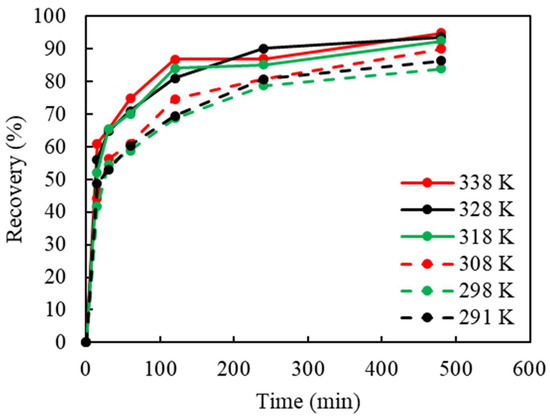 The effect of temperature was also studied. Due to the high vapor pressure of NH3, the evaporation of NH3 from a solution (NH4OH) to gaseous phase (NH3) is increased at a higher temperature. Therefore, the temperature range selected was from 18 °C (natural temperature of lixiviant solution) to 65 °C. As revealed in Figure 6, elevated temperatures did not significantly affect Cu recovery or the leaching rate. The temperature influence can be divided into two ranges: a lower temperature zone from 18 to 35 °C, and a higher temperature zone from 45 to 65 °C. At lower temperatures, the average Cu recovery was 88%, while at higher temperatures, an average recovery of 93% was achieved.
