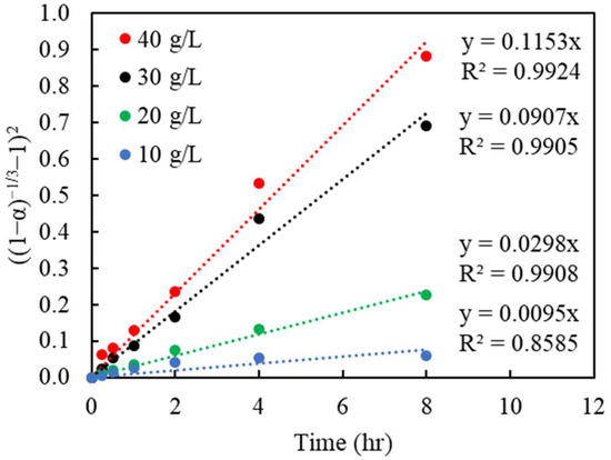 To determine the goodness of fit, the Cu recoveries in % obtained from the batch leaching experiments, with regard to different particle sizes and changing Cu(II) concentrations, were converted to the reacted fraction, α (which ranges from 0 to 1, with 0 being unreacted, and 1 being fully reacted). The left term containing α, in each model, was plotted versus the reaction time. The linear regressions from the kinetic model are shown in Figure 7, Figure 8 and Figure 9, respectively. The slopes of each linear line, k, are the rate constants varied by the considered variables.