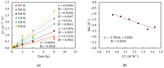 The relationship between the reaction rate and temperature can be described via the Arrhenius equation, and the activation energy (Ea) was evaluated in the context of the Zhuravlev changing-concentration model (Equation (9) [41]. To analyze the effect of the temperature, a plot of time vs. was performed, with each series corresponding to a temperature (see Figure 9a). The regressed slopes, which corresponded to the rate constant () from Figure 9a, were then plotted to determine the activation energy (Ea), which is calculated via taking the natural logarithm of the rate constant (lnkT/h−1) versus the inverse of the temperature (T−1/K−1), as shown in Figure 9b. The value of the resulted slope can be depicted as −Ea/R, where R is the gas constant of 8.314 J·K−1·mol−1. From this regression, the activation energy (Ea) in the Cu-NH3 leaching system was determined to be 5.37 kcal/mol (or 22.49 kJ/mol), which suggests that this leaching reaction is primarily controlled by mass transport.
