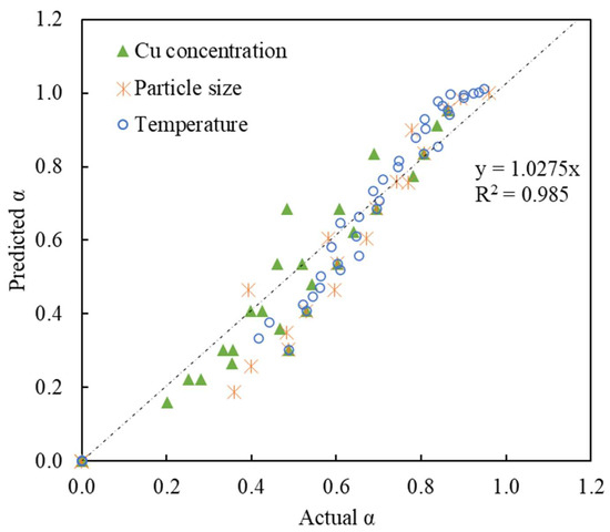 In a direct comparison considering Equation (15) versus Equation (16), the R2 of both model expressions showed an extremely similar goodness of fit (with R2 of 0.985 and 0.983). Because of the similarity of both models in terms of the feasibility of predicting the α, the original derivation of the Zhuravlev model with the first-order expression of and r0 (Equation (15)) was chosen for the condition of the CSTR CCL circuit. A more detailed evaluation and comparison of the two methodologies and their applications in batch leaching and CCL circuits is elaborated in the work by Lin [45].