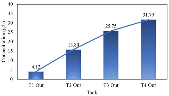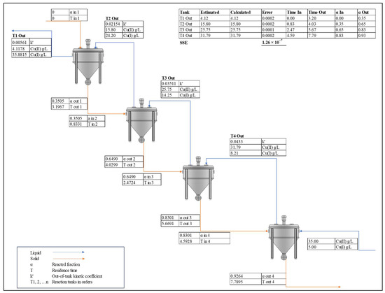A significant change to be noted in the inputs is the rate coefficient, now held as a variable which differs according to the concentration in each tank. The radius of particles is 1 mm (top size diameter of 2 mm), and the reaction takes place under ambient temperature. The starting lixiviant, composed of 35 g/L Cu(II) and 5 g/L Cu(I), enters the counter-current leaching circuit in Tank 4, at a flow rate of 500 L/min. The pulp density is 10.58% (solid/liquid ratio of 0.1058). The solid phase, containing 30%wt. of Cu(0), flows through the circuit from Tank 1 at a mass flow rate of 3.33 t/h for the total solid, and 1 t/h for the Cu(0), respectively. The rate coefficient, varying under different leaching conditions, was calculated to be 0.001363, according to Equation (15).