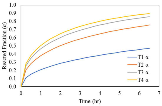 Comparison of the model-predicted reacted fraction with that of the experimental results, using Equation (15).