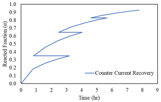 In the counter-current leaching circuit, starting from Tank 1, the solid is the most intact and the lixiviant is the most depleted in the oxidizer, and the reverse is true for Tank 4. In this case, the predicted value for the reacted fraction in Tank 1 undergoes the constant concentration model, where the initial reactant concentration is 4.12 g/L, as shown in Figure 14 (blue curve). It should be noted that the retention time in Tank 1 is 3.2 h, which is sufficient to achieve the same recovery as in the next leaching tank. Subsequently, in Tank 2, the starting concentration fell (the orange curve), under an in-tank concentration of 15.80 g/L. Similarly, as Tank 4 is the beginner tank with the highest concentration of Cu(II) and the last tank with most diluted Cu(0) in a solid state, the predicted model therefore fits in the later retention time of the yellow curve. In fact, the operation manner in the counter-current leaching circuit resulted in a “zig-zag” shape of the leaching curve, where the α corresponds to two different times when the solid changes tanks that have two different concentrations, as shown in Figure 15.