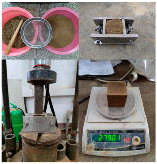 The rammed earth used for the experiment was obtained from Mianyang (104.56 E, 31.53 W), Sichuan Province, consistent with the rammed–earth used in the building, and approximately 5 kg of the sample soil was taken, crushed, sieved with a test sieve (square hole diameter of 1.6 mm), and pressed into a shape in a mold, as shown in Figure 1 [19]. A total of 18 square specimens (L = 50 mm) with a mass of approximately 280 g and a density of approximately 2240 kg/m3 met the strength requirements of the standard compressive strength of 2.0 MPa [20] for rammed–earth materials [21].
