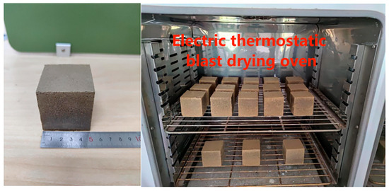 After the prepared specimens were maintained at 25 ± 0.5 °C and 60 ± 2% RH for 7 d, the specimen was dried in a dry box at 105 °C for 24 h as shown in Figure 2 (specimens intact after drying) [22,23,24], and then weighed. When weighed three times in a row and the change in specimen weight was less than 0.1%, the specimens were considered completely dry. The mass of the dried specimen was approximately 252 g and its density was approximately 2016 kg/m3.